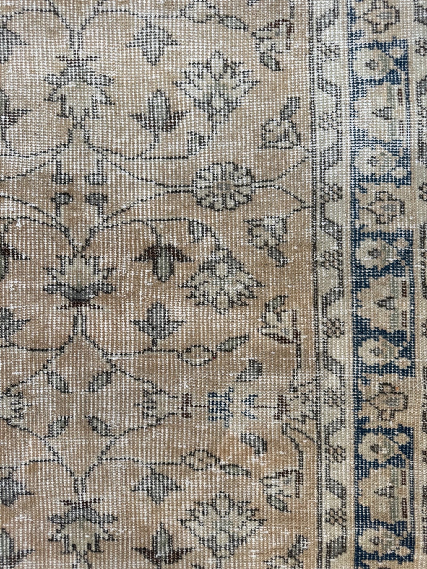The neutral base colour with a boarder in deep denim blue is our favourite colour combination. With motifs in sage, hazelnut and seafoam rounding out the palette to make this a perfect vintage piece.